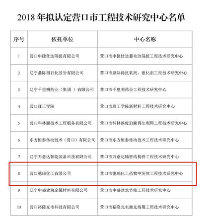 2018年11月9日,營(yíng)口市科學(xué)技術(shù)局公布了關(guān)于擬認(rèn)定2018年?duì)I口市工程技術(shù)研究中心的公示,依托營(yíng)口德瑞化工有限公司申報(bào)的“營(yíng)口市德瑞化工藥物中間體工程技術(shù)研究中心”被列入2018年度市級(jí)組建計(jì)劃中。
